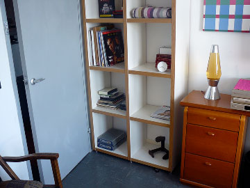 Living room with hi-fi, large collection of DVD movies & music CDs.